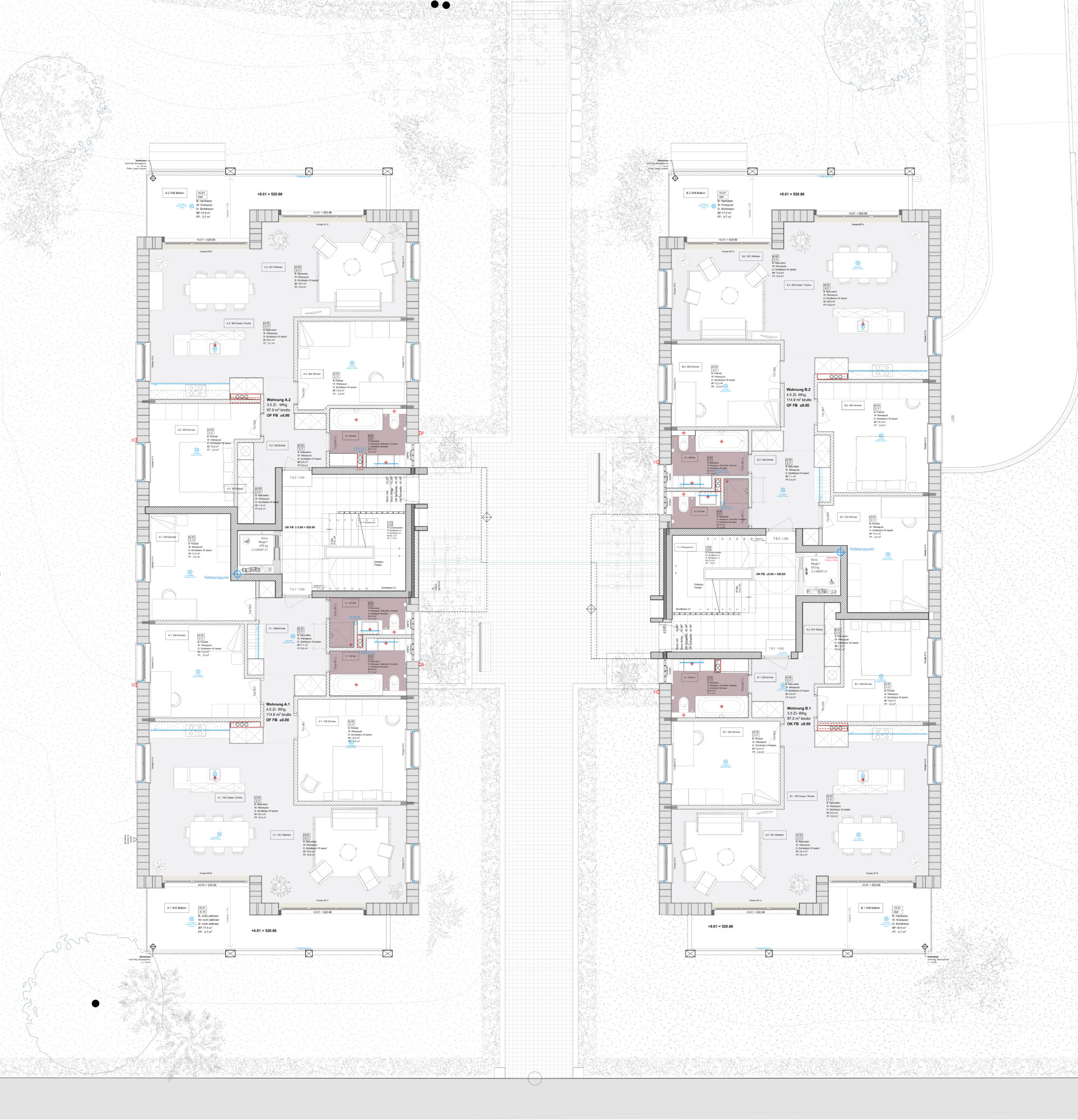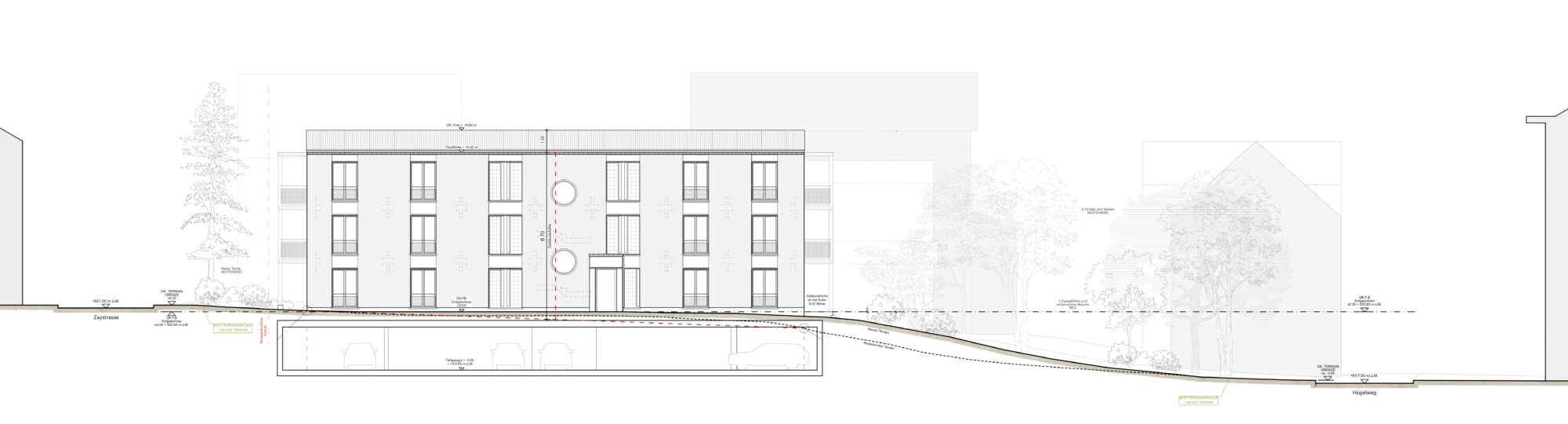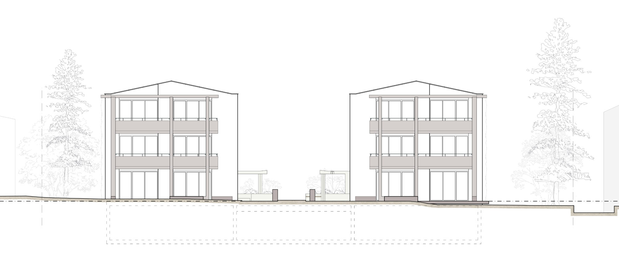 Mit einer klaren, linearen Setzung von zwei parallelen Zeilenhäusern wird entlang der typischen Quartierstrasse im Mittelland auf selbstverständliche Art und Weise verdichtet. Die ehemaligen, giebelständigen Einfamilienhäuser werden durch zwei Mehrfamilienhäuser ersetzt, die sich zur Strasse hin mit angemessen breiten Stirnfassaden zeigen. Erst in der Tiefe der Parzelle entwickeln diese sich zu klar erkennbaren Mehrfamilienhäusern mit entsprechenden Längen.