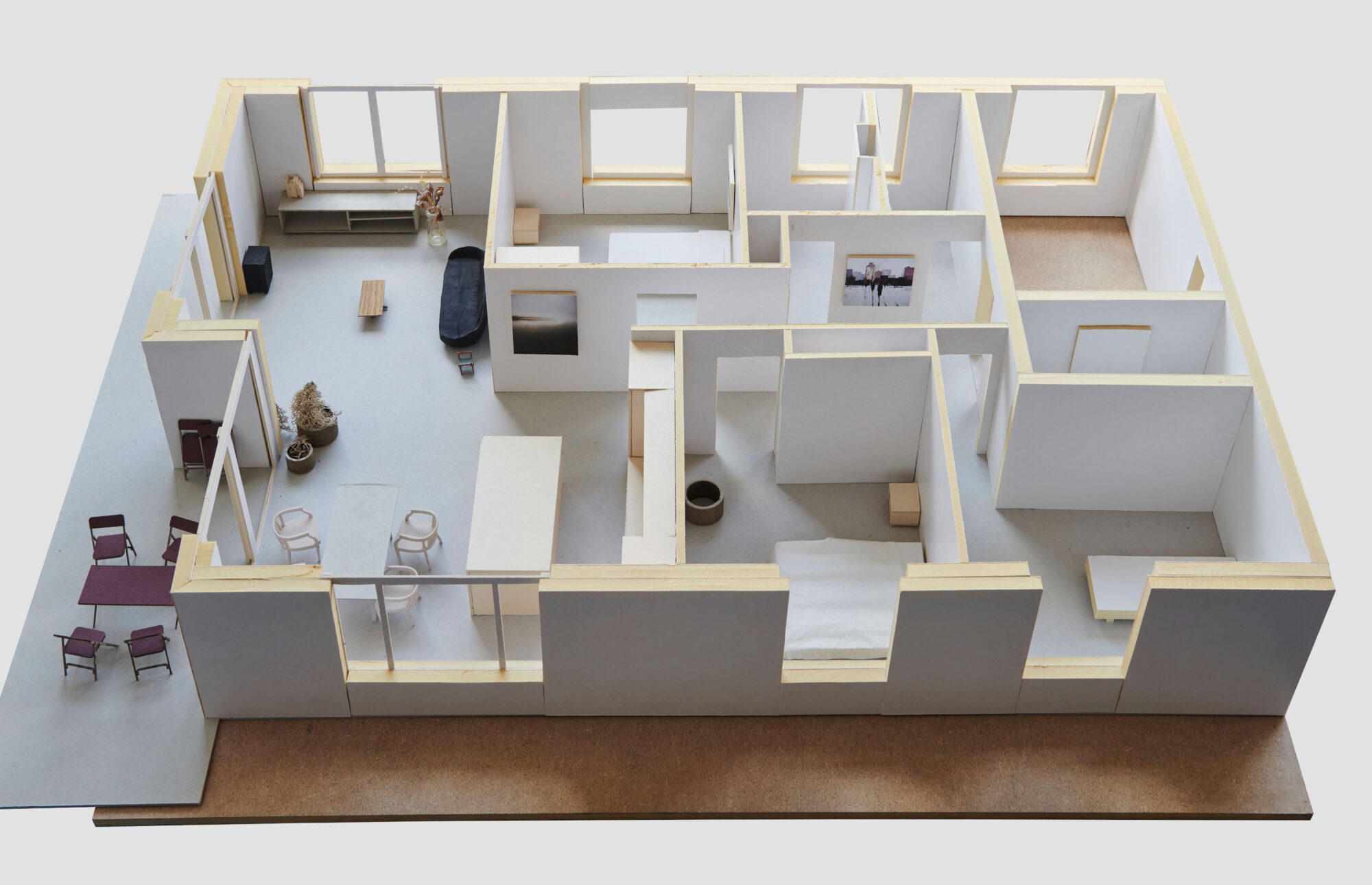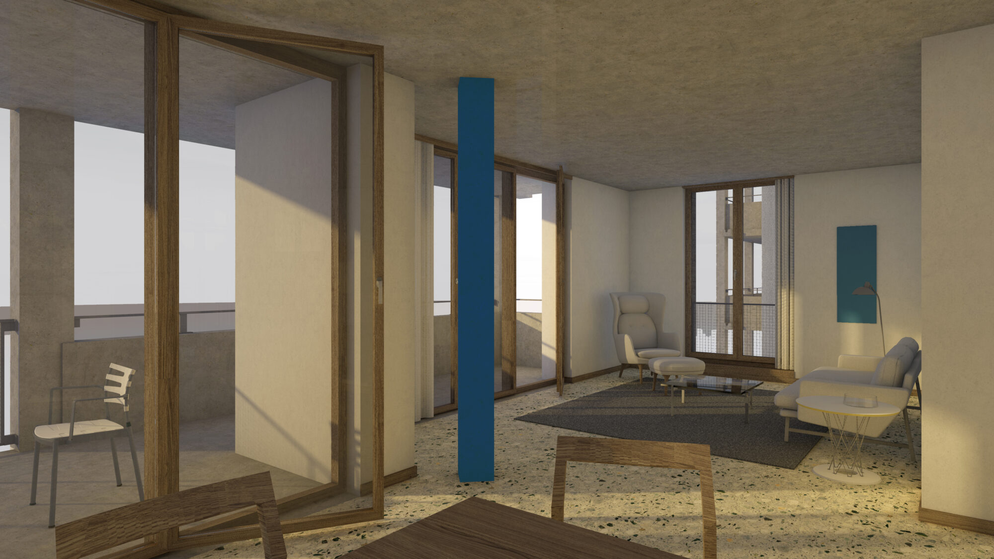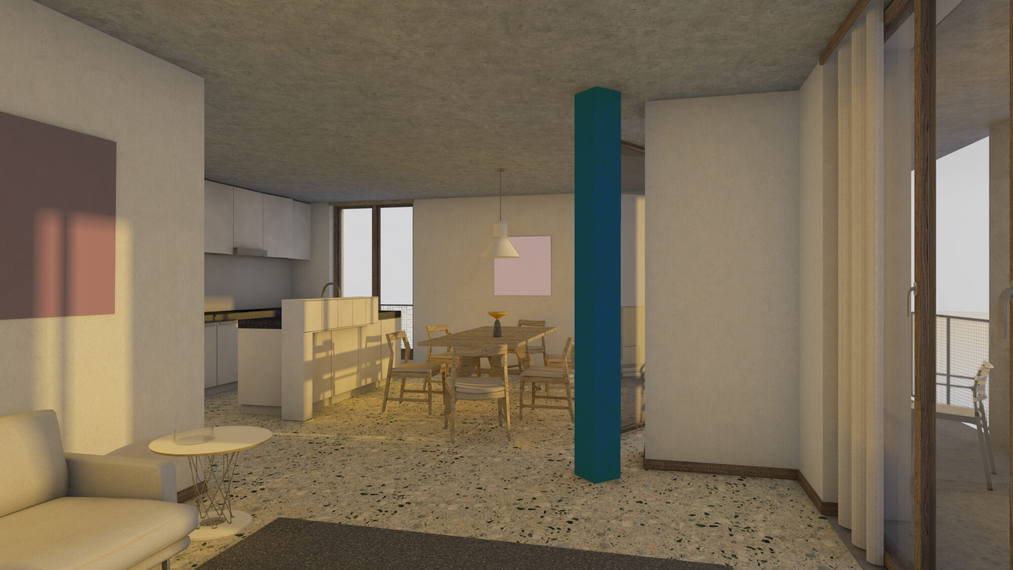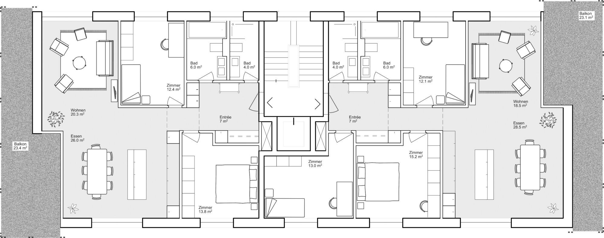 Die zwölf identisch funktionierenden Wohnungen profitieren von 11m Gebäudelänge und dreiseitiger Ausrichtung. Dies ermöglicht im Verhältnis zur Netto-Wohnfläche (4.5 Zi- Whg:100m2/ 3.5 Zi-Whg: 85m2) effiziente und grosszügige Grundriss-Layouts, welche praktisch ohne Erschliessungsflächen auskommen. Man betritt die Wohnung in einem wohlproportionierten Entrée, welches über die Nasszellen natürlich belichtet wird. Auf eine kurze räumliche Verengung, von welcher aus die Schlafzimmer erschlossen werden, öffnet sich der grosszügige, dreiseitig orientierte Wohnraum. Dieser wird durch die Küche einerseits und die vorgelagerte Balkonschicht andererseits räumlich gegliedert. Eine über die gesamte Gebäudetiefe durchgehende Balkonschicht erweitert den Wohnraum und schafft die wichtige Pufferzone zum öffentlichen Raum. Die so geschaffene Intimität erlaubt grosse, bodentiefe Fenster, die den Blick ins Quartier und die innerschweizer Berglandschaft freigeben.