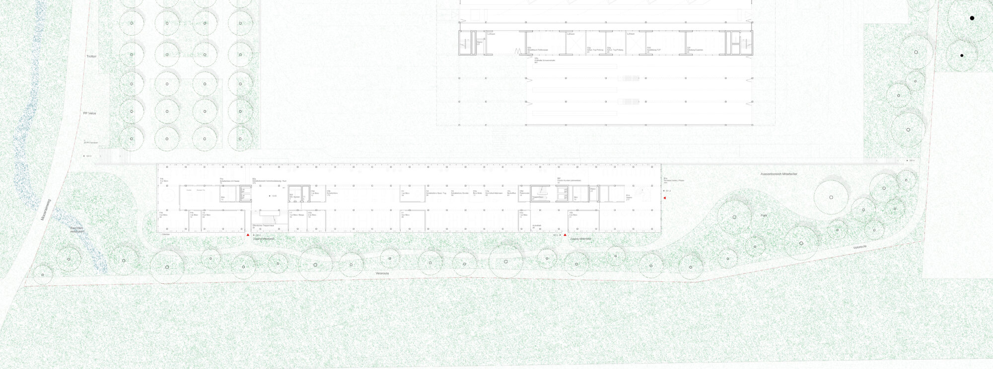 Am Siedlungsrand zwischen Bahnlinie und Hauptstrasse schafft das neue Strassenverkehrs- und Schiffbauamt einen Übergang vom Gewerbegebiet zur Kulturlandschaft. An erhöhter Lage entlang den Geleisen thront der lange, schmale Büro-Holzbau als neuer Landmark, der von weitem gut sichtbar ist. Die aussergewöhnliche Gebäudelänge von rund 115m verstärkt die Präsenz des Gebäudes, gibt ihm Klarheit und Ruhe. Die Prüfhalle wird im flacheren Parzellenteil positioniert und steht in direkter Adhäsion zu seinen benachbarten flachen, ausladenden Zweckbauten.