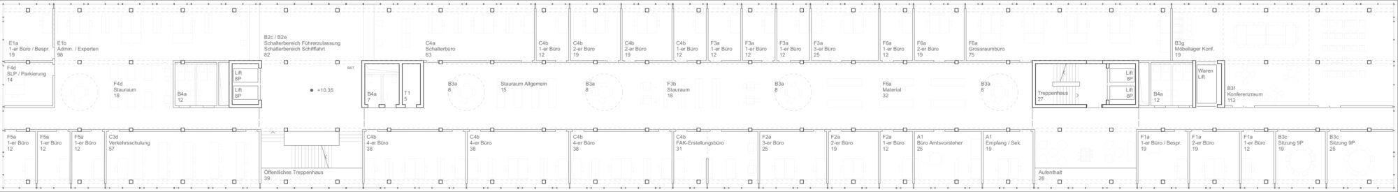 Der Haupteingang des Bürobaus bildet den Auftakt der öffentlichen Schalterbereiche, welche über alle Geschosse durch das grosszügige, öffentliche Treppenhaus erschlossen sind. Eine lange, gallerieartige Schalterhalle im 1. Obergeschoss mit Blick auf die Prüfhallen und Abschluss im öffentlichen Gastrobereich im Osten ist der repräsentativste, öffentlichste Raum des Gebäudes. Durch die geschossweise Organisation der einzelnen Departemente und die zwei vertikalen Erschliessungen – einmal öffentlich, einmal intern – resultiert ein sehr kompaktes, effizientes Volumen.
