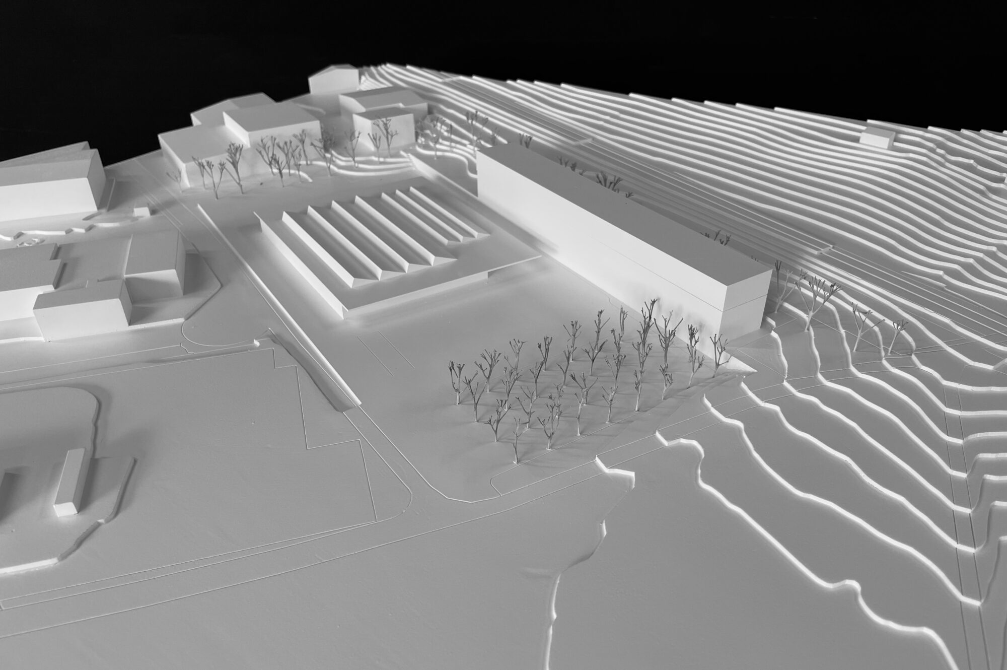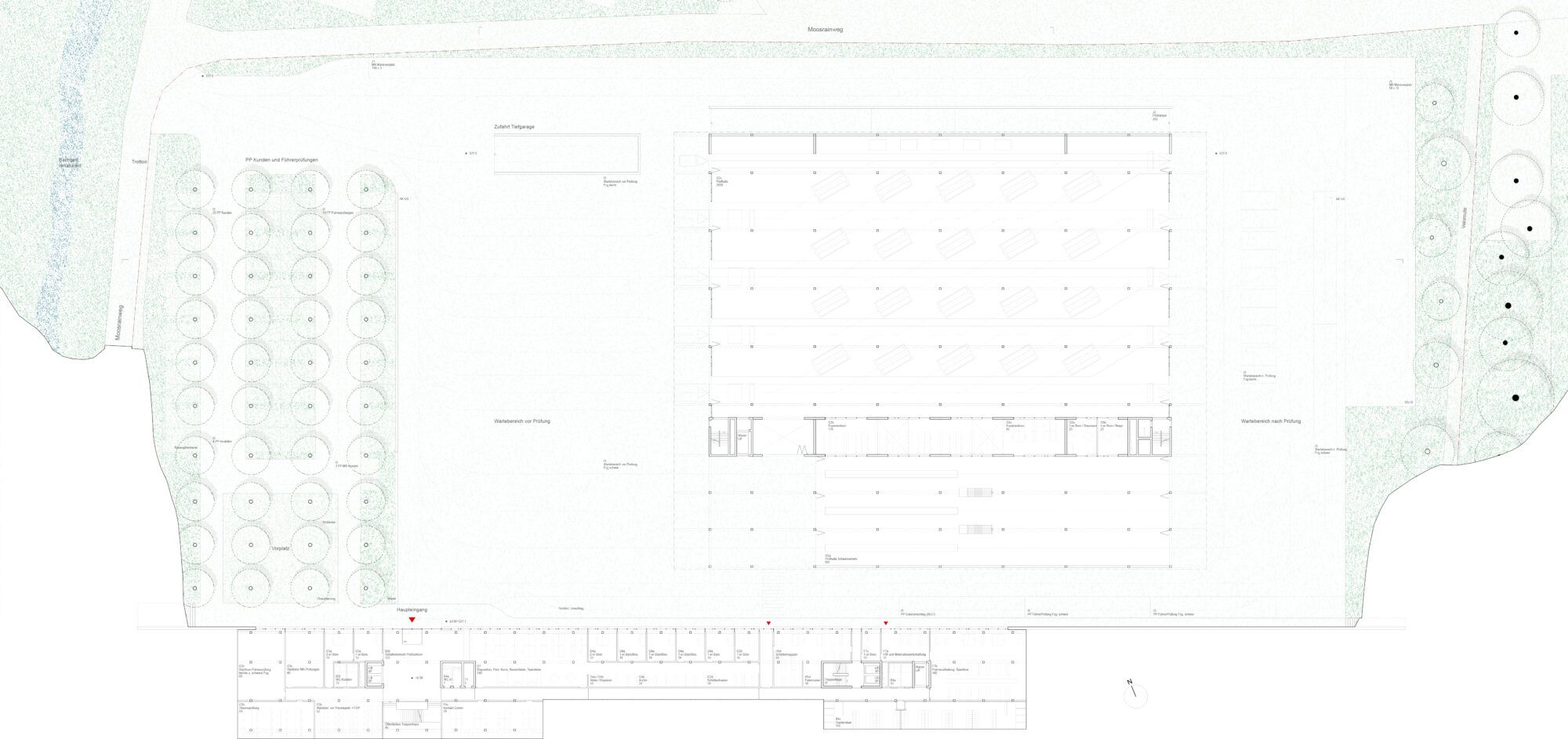 Der Zeilenbau der Büronutzungen ist selbstverständlich in den ansteigenden Hang hineingesetzt, so dass er einerseits einen klaren Abschluss des ebenen Prüfhallenvorplatzes und Besucherparkplatzes definiert und andererseits ein nur für die Mitarbeitende bestimmter, verkehrsbefreiter Aussenraum auf dem oberen Garten-Niveau geschaffen wird. Zudem werden die beiden unterschiedlichen Niveaus von einer geradlinigen Stützmauer geprägt, welche sich östlich und westlich aus der Gebäudeflucht heraus entwickelt. Die Baumreihen der Besucherparkplätze definieren den Vorplatz zur Prüfhalle räumlich und bilden eine Art Filterschicht zur offenen Kulturlandschaft.