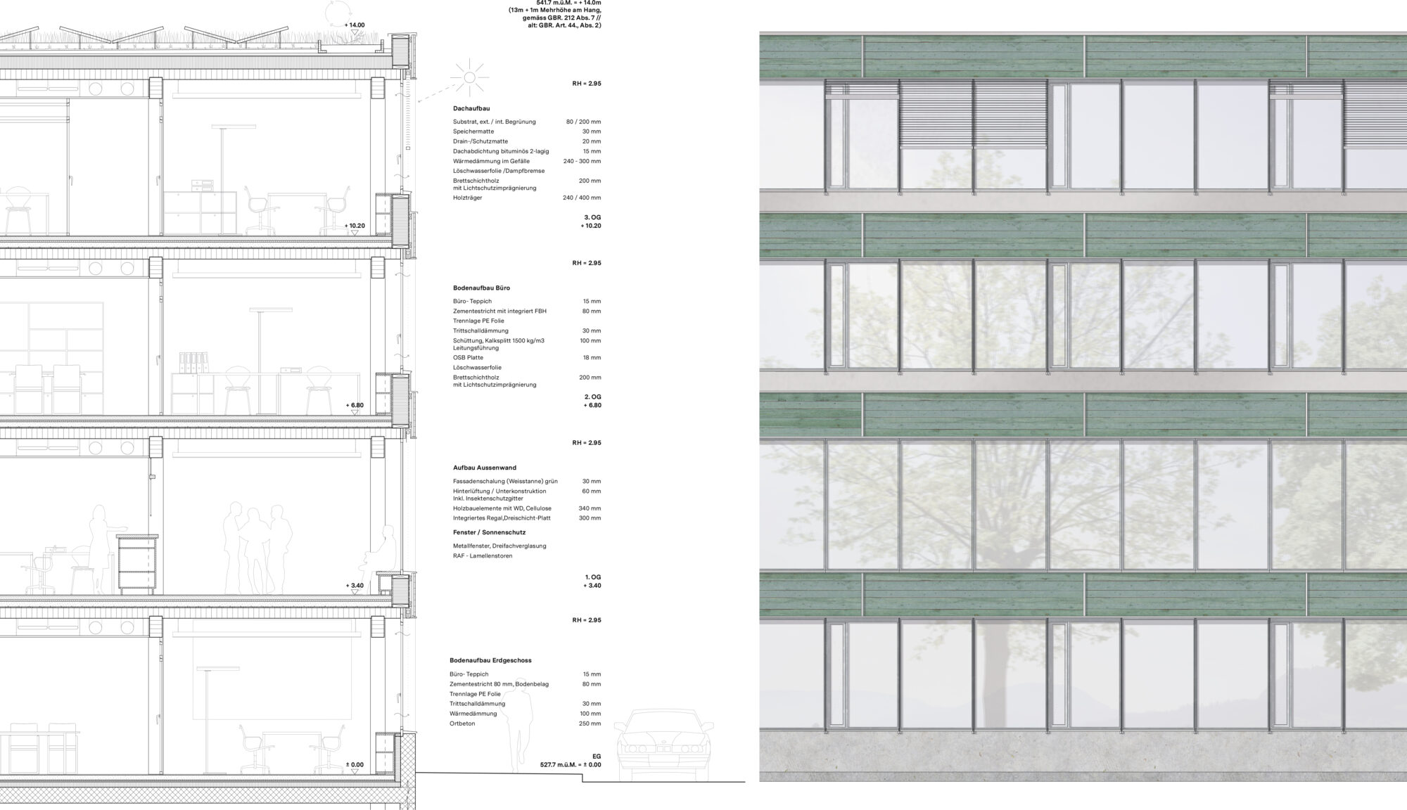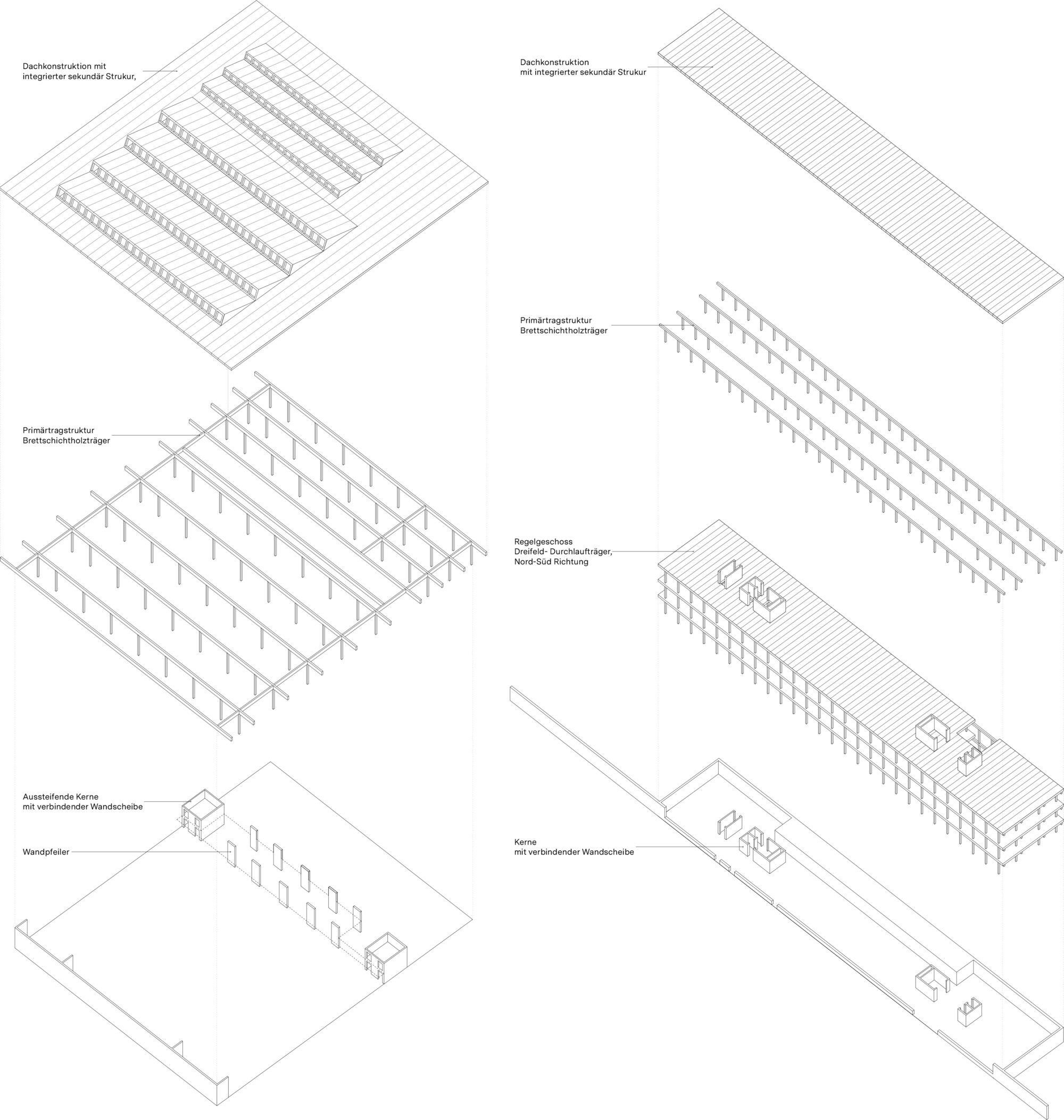 Das Material Holz wo immer möglich zu zeigen und mit der Kraft eines klaren Fügungsprinzips das zeitgenössische Holzbau-Handwerk zu zelebrieren prägt die entwerferische Grundhaltung. Mit ihrer klaren und einfachen Tragstruktur legen die Gebäude eine starke Präsenz an den Tag, die einheitliche Farbgebung verbindet die beiden Gebäude optisch. Material, Farbigkeit, fein ausgearbeitete Detaillierung und sorgfältige Massstäblichkeit machen die Gebäude für den Menschen zugänglich.