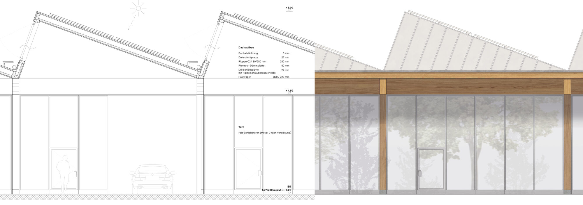 In seinem Ausdruck vermittelt das Projekt zwischen der Direktheit landwirtschaftlicher und gewerblicher Bauten und selbstbewussten, zeitgenössischen Büro-Holzbauten. Die zwei geschwisterlichen Baukörper – ähnlich und doch von unterschiedlichem Charakter – zeigen einen je individuellen, nutzungsspezifischen Ausdruck: Während der Hallenbau direkt und rau auf dem Boden des Werkplatzes steht, zeigt die Büro-Holzbaute feinplastischere Qualitäten; die Atmosphäre wird bestimmt durch ihre Konstellation miteinander.