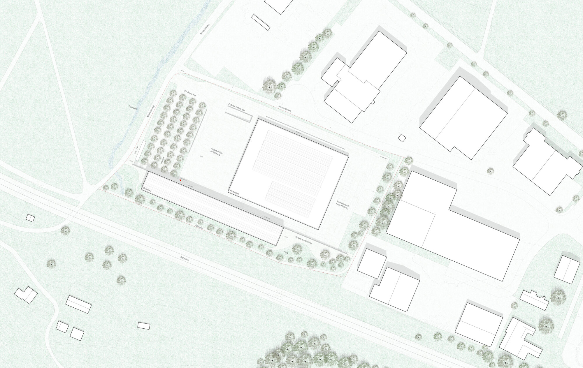 Die Volumetrien der beiden Gebäude spiegeln in erster Linie ihre Nutzungen wieder. Auf den zweiten Blick erkennt man in der gewählten Setzung die Absicht, dem umliegenden Kulturland möglichst viel Raum zu lassen und so einen durchlässigen Abschluss des Industrieareals zum westlichen Grünraum zu etablieren.