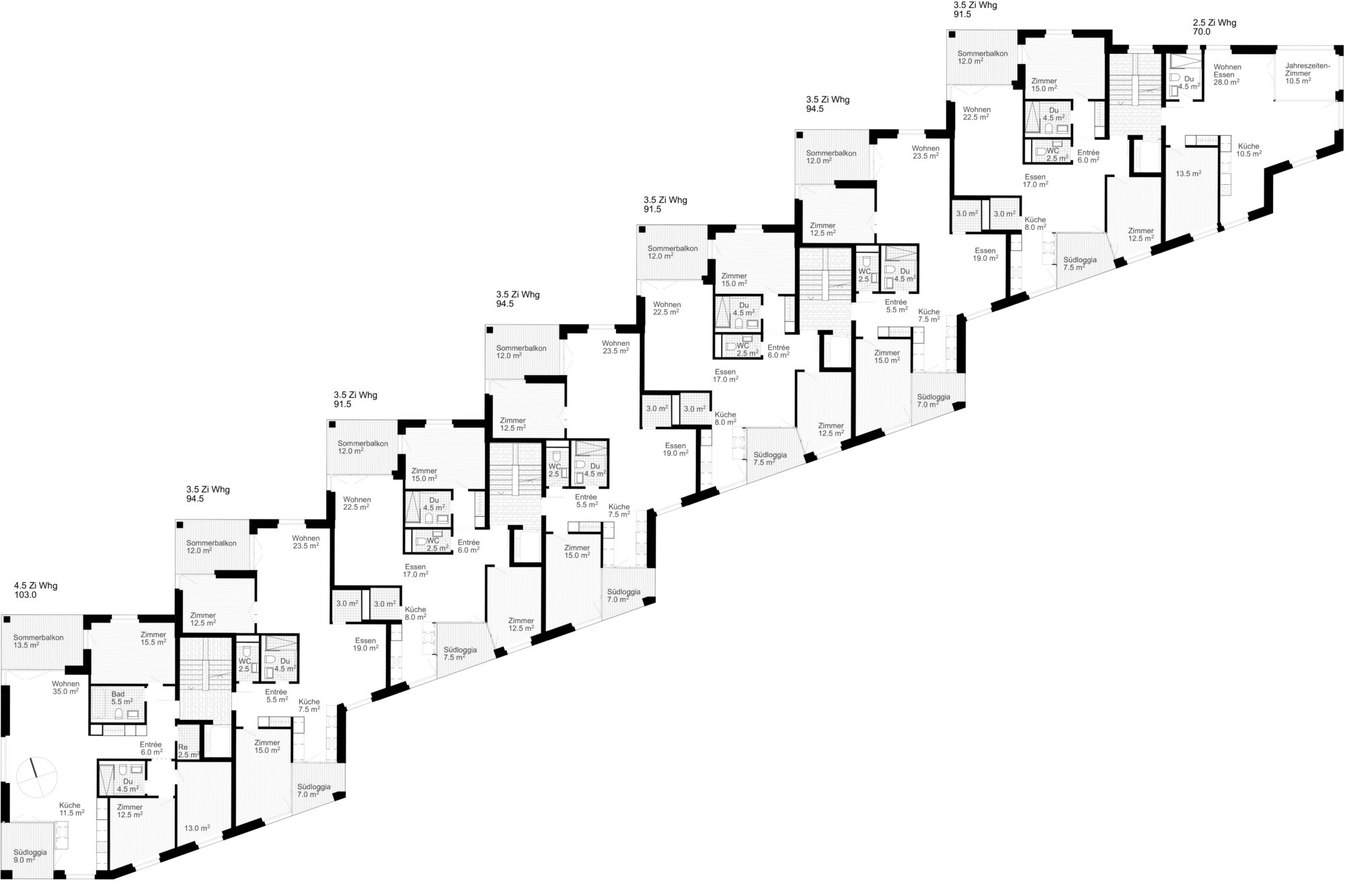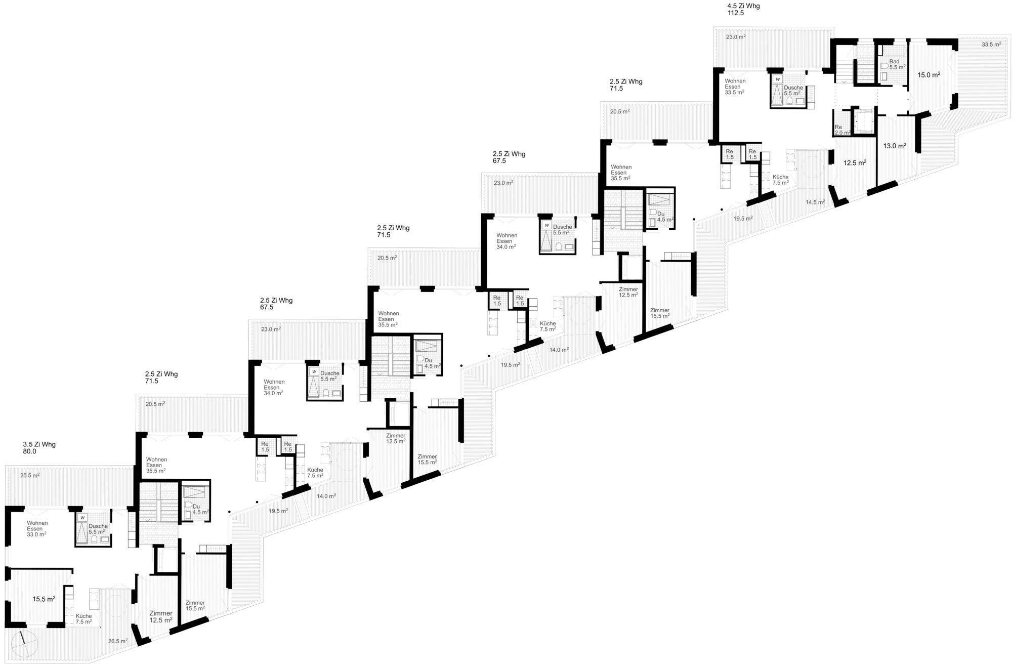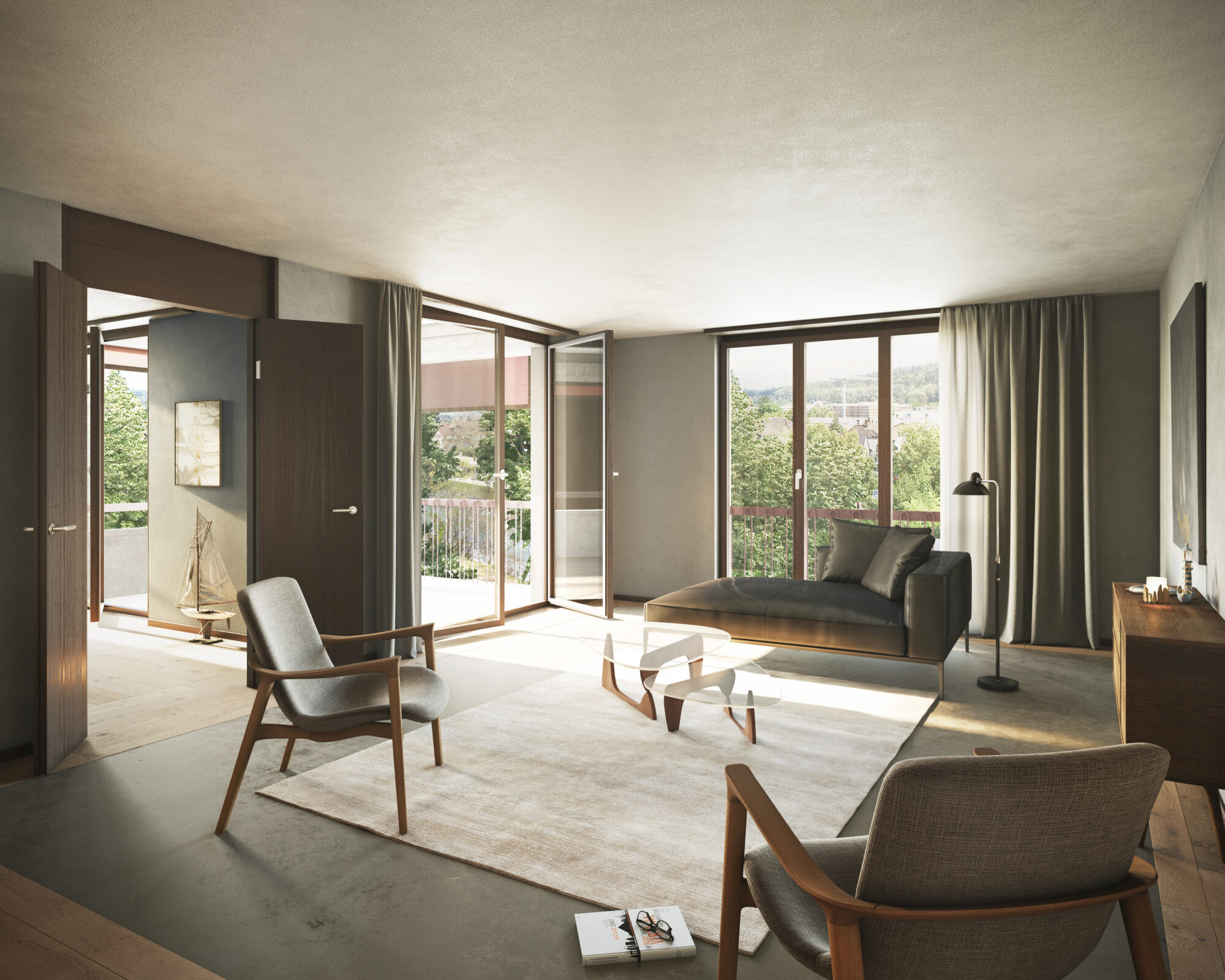 Alle Wohnungen sind mindestens dreiseitig orientiert: Die Hauptausrichtungen sind jeweils die Glatt im Norden und die Mittagssonne im Süden. Durch die Staffelung der Fassaden öffnen sich die Wohn- und privaten Aussenräume aber auch gegen Osten und Westen.