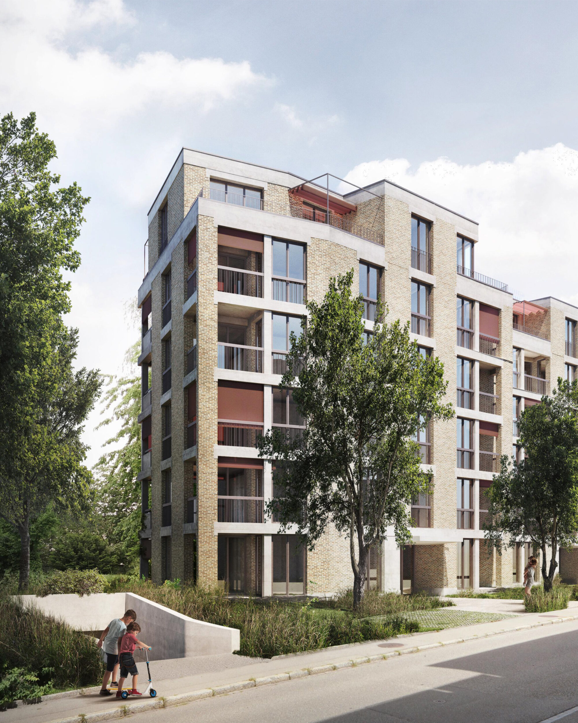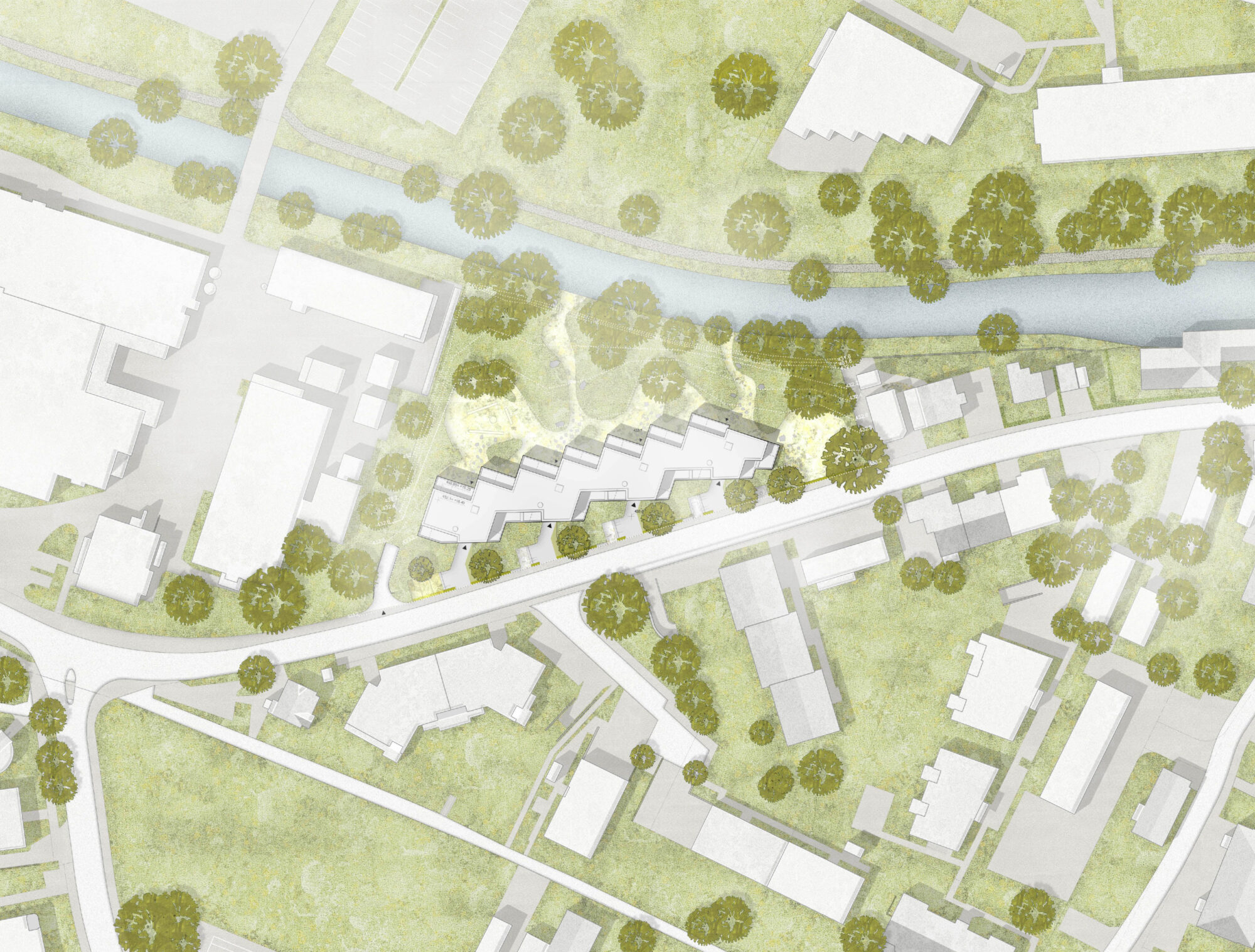 Das Aussenraumkonzept basiert auf dem engen Zusammenwirken von Freiraum und Bebauung: Die Setzung ermöglicht eine grosszügige Grünanlage, ein Wohnen im Park mit direktem Bezug zum Gewässer. Die grösstmögliche, zusammenhängende Grünfläche entlang des Flusses ist der Gewinn für Alle. Anstelle privat abgegrenzter Aussenräume weisen die Wohnungen im EG privat genutzte Loggien und Terrassen auf.
