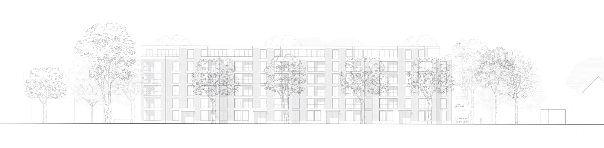 Der Neubau befindet sich in einem ruhigen Quartier in Gehdistanz zum Zentrum Dübendorfs. Das Projekt antwortet mit einer eindeutigen Setzung entlang der Strasse, die den im Bestand sehr heterogenen Strassenraum sowie die Glatt als Naturraum stärkt. Die grosse Fassadenlänge wird durch die Staffelung des Baukörpers auf ein ortsübliches Mass heruntergebrochen und bildet damit einen massstäblich gut integrierten Link zwischen den unterschiedlichen Stadtstrukturen. Die Staffelung ermöglicht zudem die Aufnahme der zueinander versetzten Winkel von Glatt und Strasse und wird elegant zu einem innenräumlichen Mehrwert der Wohnungen.