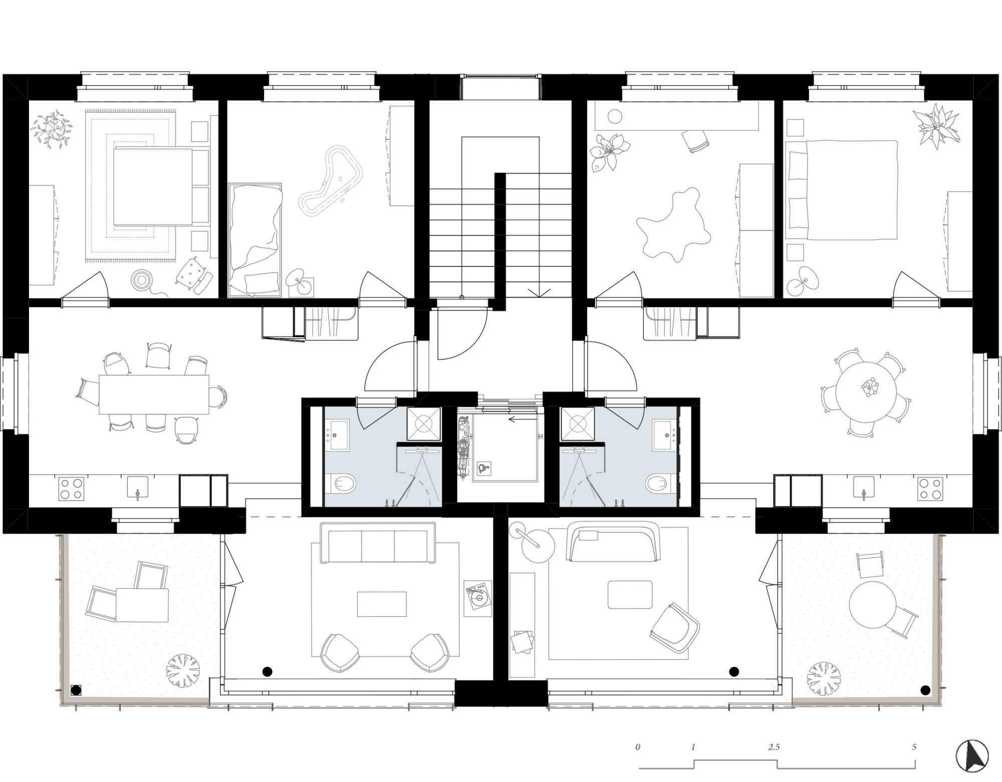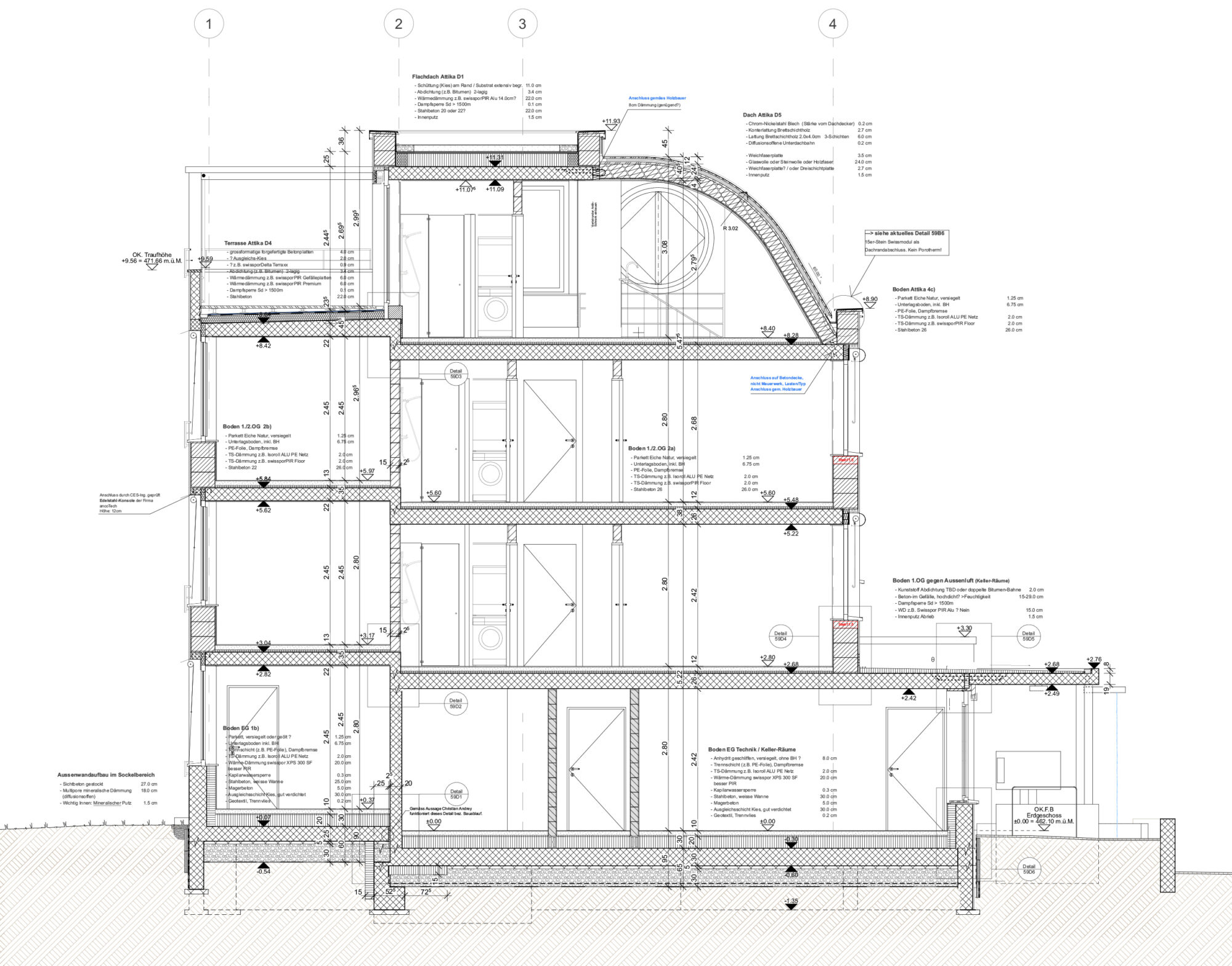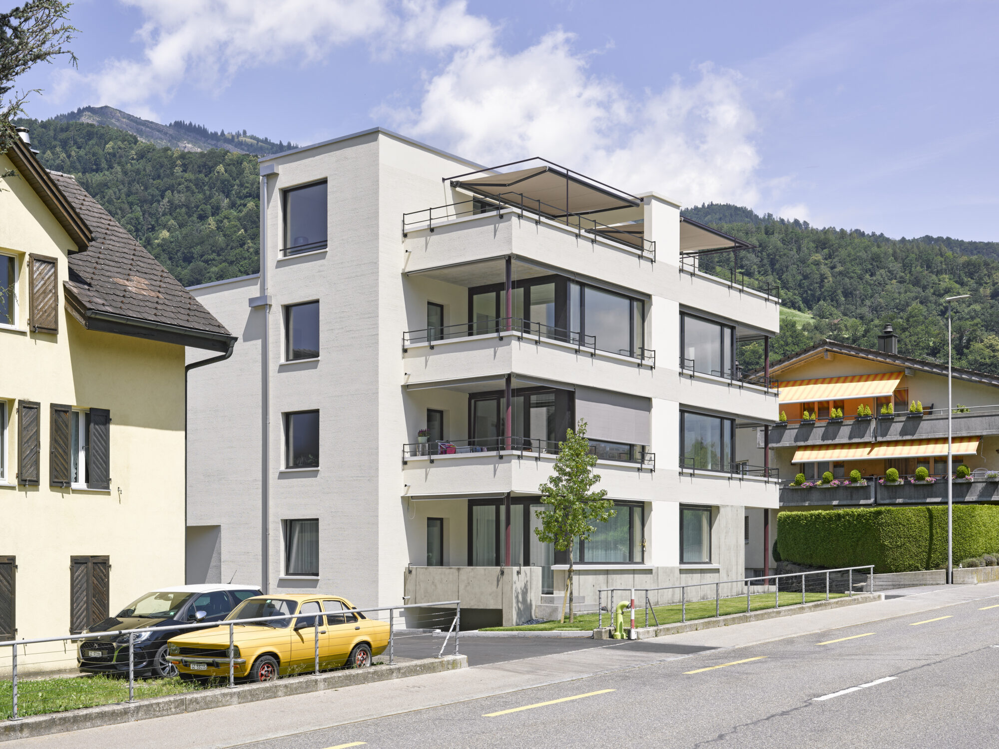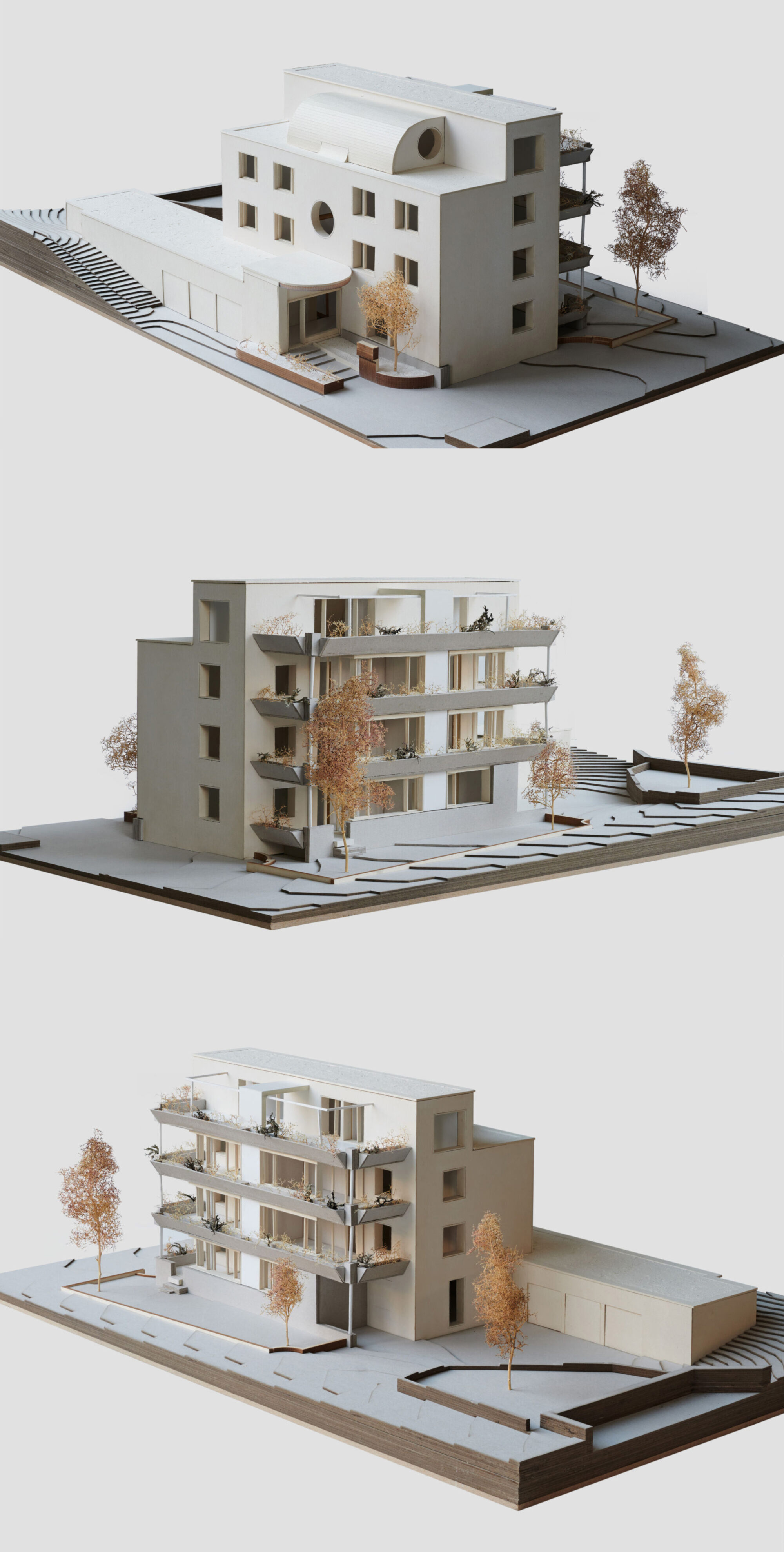 Basierend auf der Analyse der Bauten entlang der Bergstrasse bekennt sich der Entwurf mit einem ruhigen und selbstbewussten Volumen klar zur Strasse. Das Lärmschutzthema wird auf der grundrisslichen Ebene gelöst. Zusammen mit dem länglichen Volumen des östlichen Carports etabliert der neue Baukörper eine Komposition, welche trotz vollständiger Ausnutzung der sperrigen Parzelle angemessen wirkt. Das Attikageschoss ist integraler Bestandteil der Gesamtheit und unterstützt damit die städtebauliche Setzung.