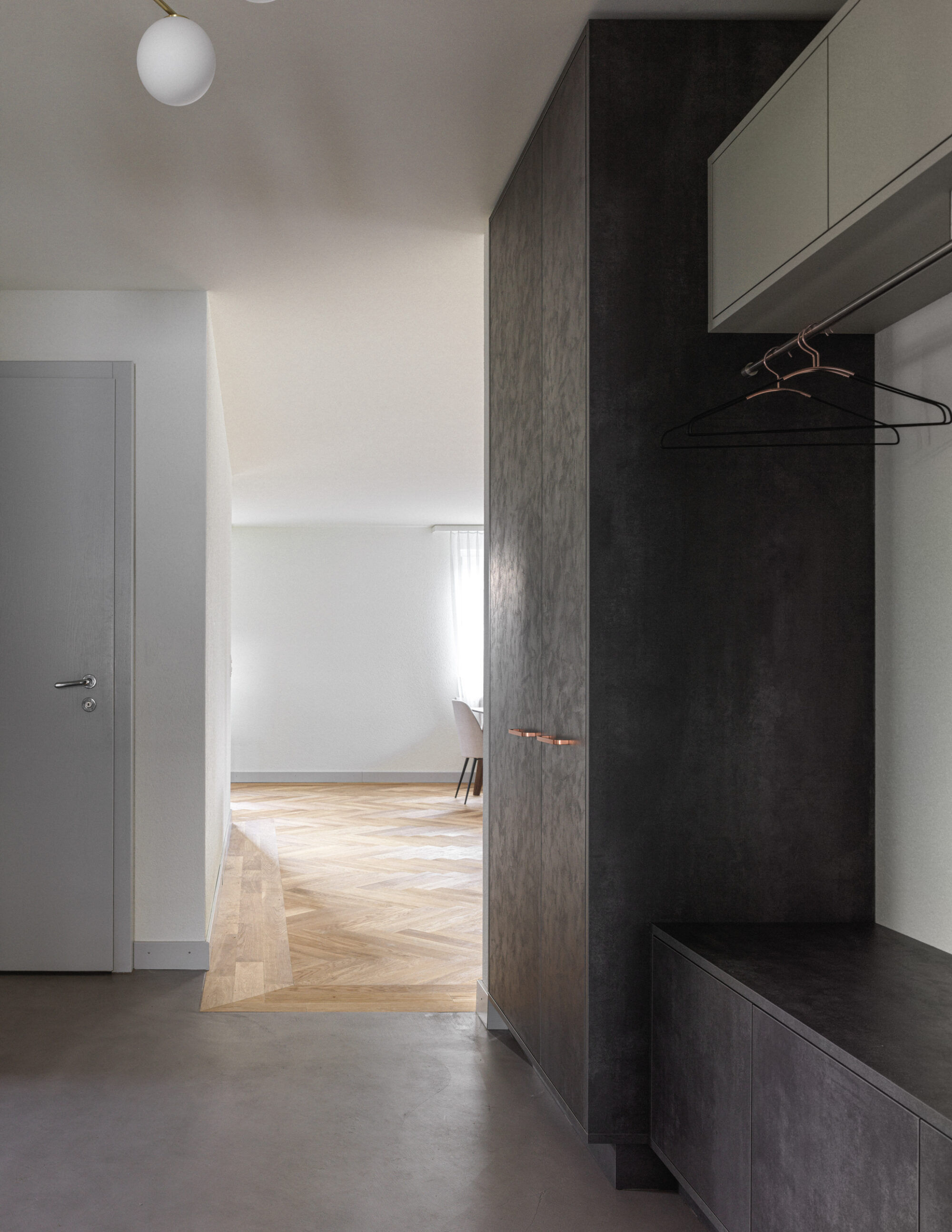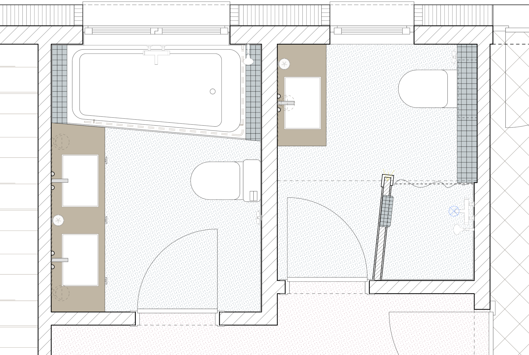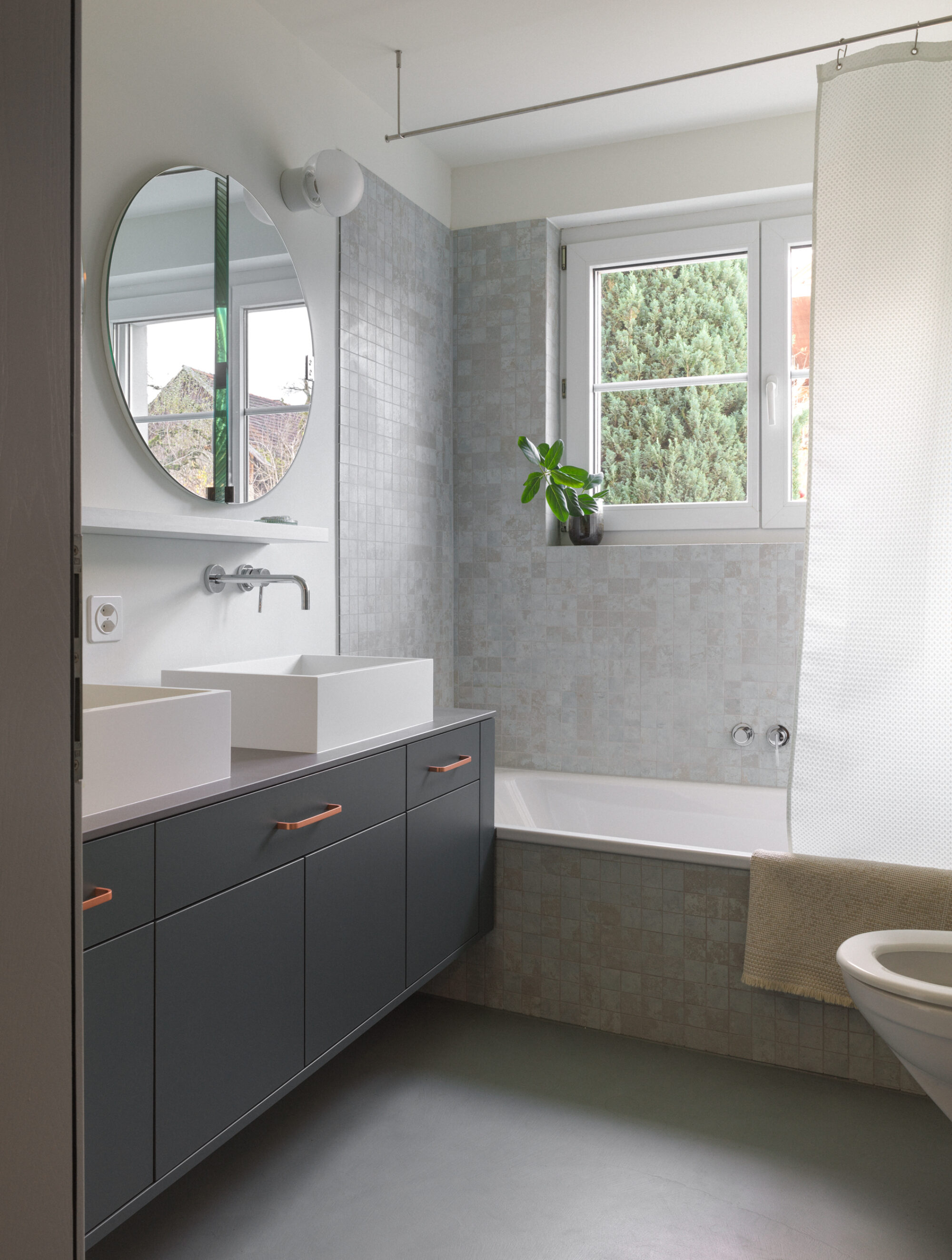 Kein Bad zu klein, um dafür eine räumliche Idee zu entwickeln. Die Sanierung zweier Wohnungen gestaltete sich als Suche von gestalterischen Spielräumen auf der Detailebene. Durch eine warme und fein abgestimmte Materialisierung und dem moderaten Hinzufügen spezifischer Elemente wurde eine atmosphärische und räumliche Aufwertung erreicht.