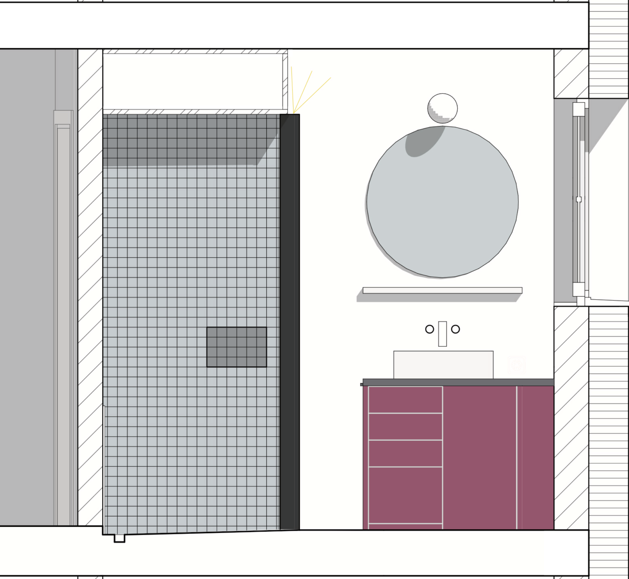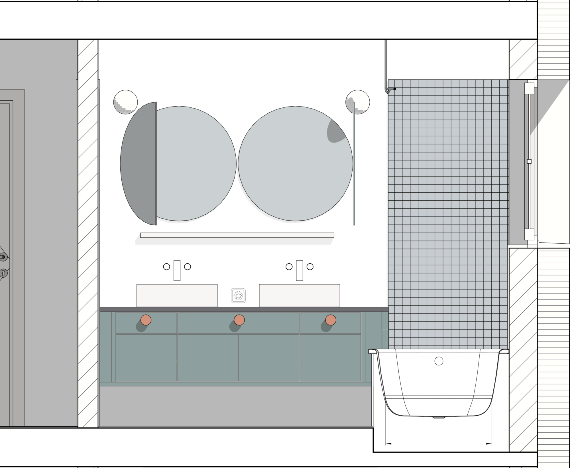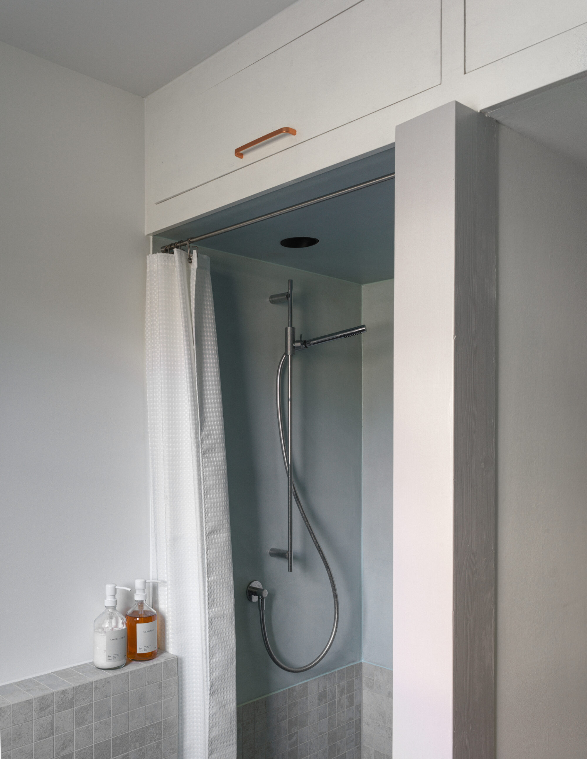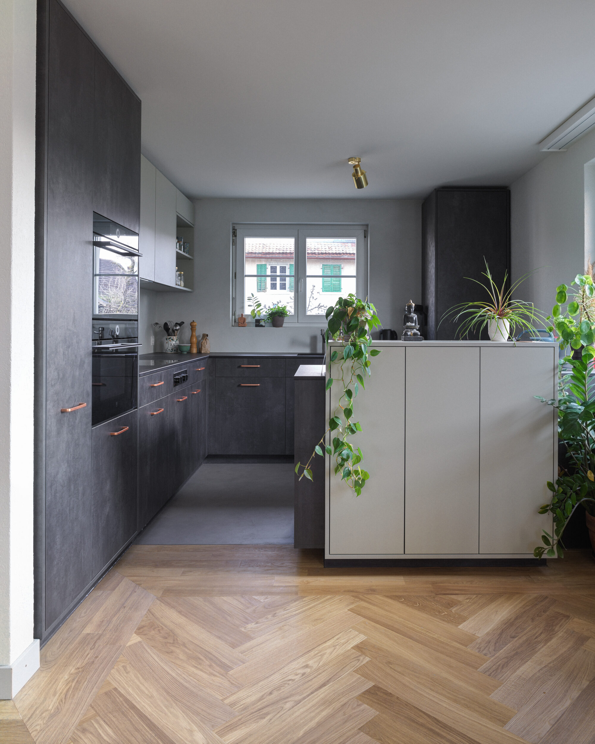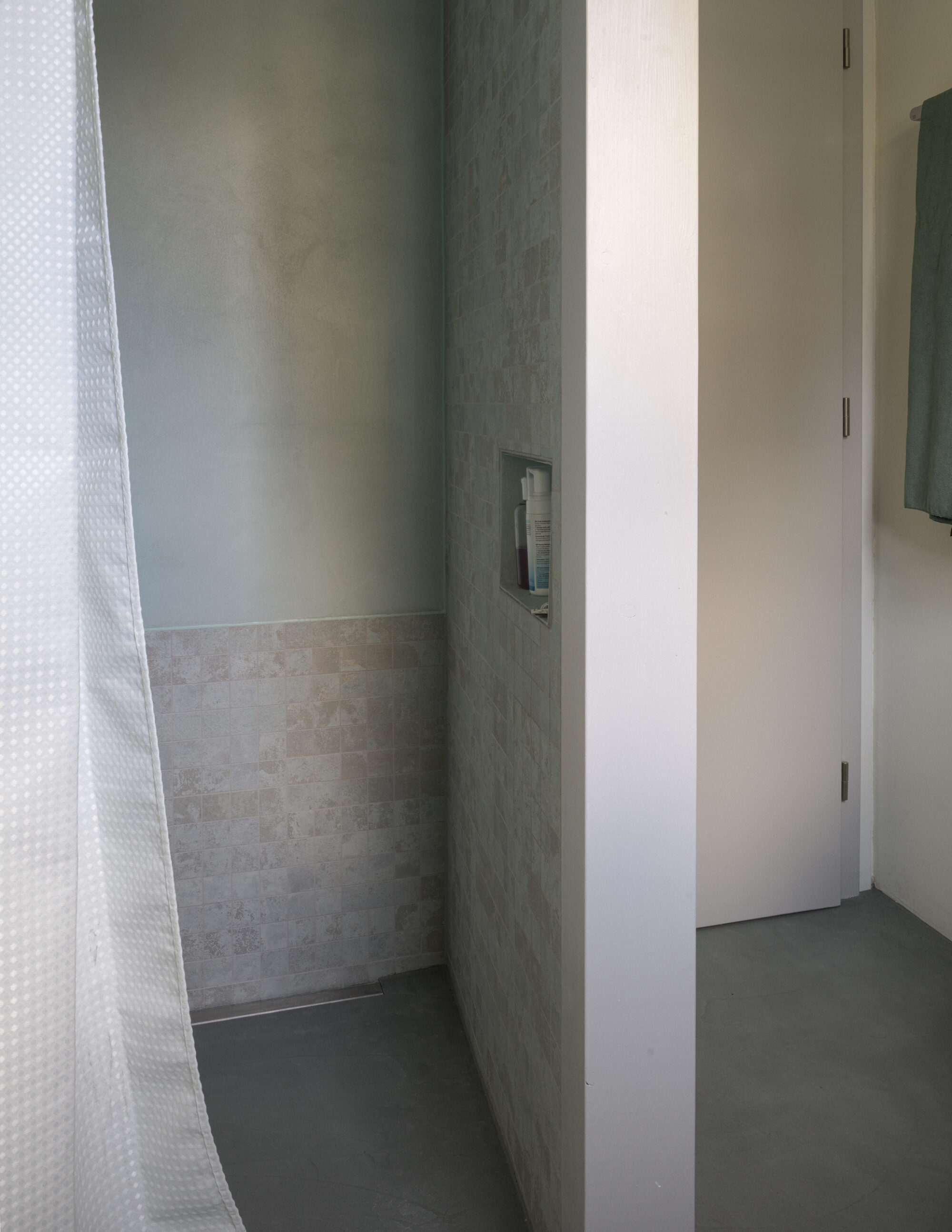 In der Küche wurde eine Insel eingeführt, welche zonierende Klarheit brachte und funktionales Kochen ermöglicht. Im grossen Bad erzeugt eine konisch zulaufende Badewanne räumliche Spannung. Im kleinen Bad gliedert eine heruntergehängte Decke den Raum und lässt ihn grosszügiger erscheinen. Zusammen mit der leicht diagonal gestellten Holzständerwand wird eine Nische zum Duschen ausgebildet und praktischer Stauraum angeboten.